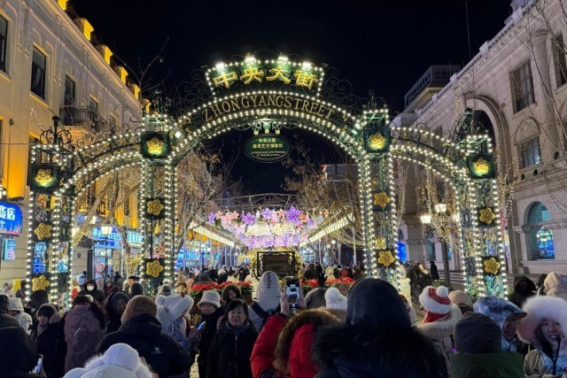 2024年12月26日,哈尔滨中央大街游人如织。新华社记者 杨思琪摄