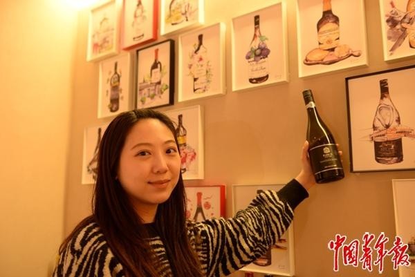 在渝北区紫薇路商业街,葡萄酒买手店“酒瓶瓶·wine shop”负责人罗天展示店内的葡萄酒装饰画。中青报·中青网记者 魏其濛/摄