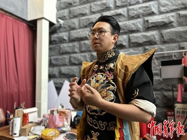 在沙坪坝区磁器口,花坞酒餐厅内部剧院负责人、专业川剧演员林森接受采访。中青报·中青网记者 魏其濛/摄