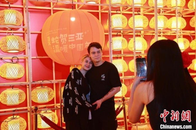 1月22日晚,“灵蛇贺三亚 温暖中国年”2025年三亚新春旅游文化系列活动之小年特别活动新春游园会上,外国游客在春节装饰前合影留念。 陈聪聪 摄