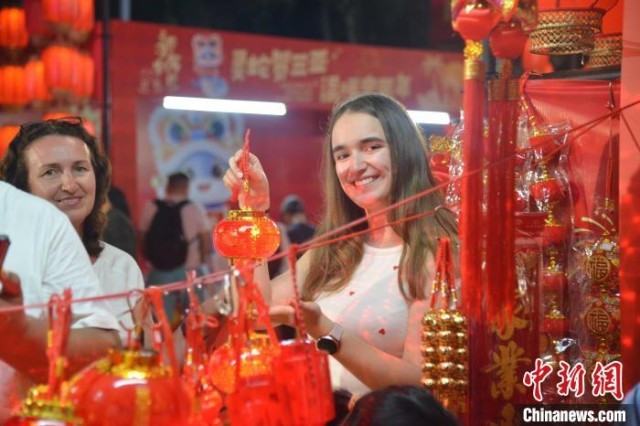 1月22日晚,“灵蛇贺三亚 温暖中国年”2025年三亚新春旅游文化系列活动之小年特别活动新春游园会举办,吸引众多俄罗斯游客前来体验中国年。张月和 摄