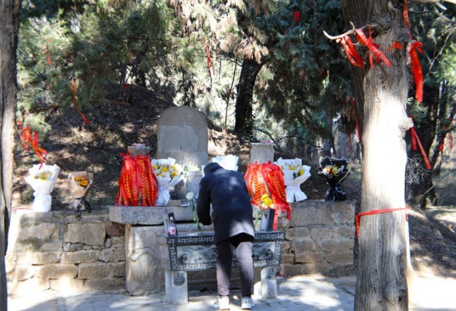甬道两侧,4棵粗壮的宋柏郁郁葱葱,一簇簇写着“感恩守护”的红绸带缀满枝头。