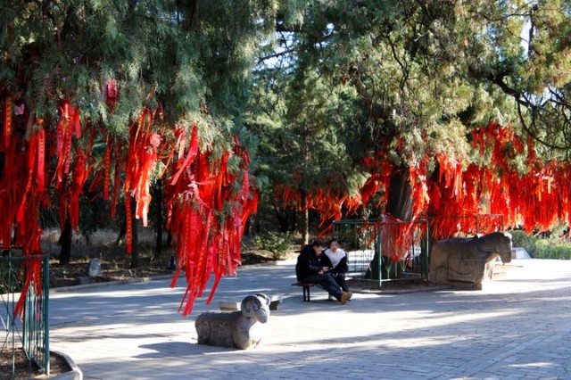 1月19日,游客在河南省平顶山市郏县三苏园景区宋柏树下休息。