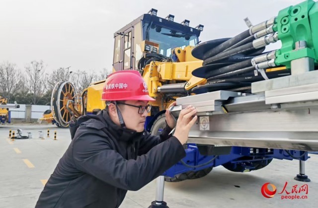 李荣鑫在查看推进梁装配间隙,确保准确无误。人民网 宋芳鑫摄