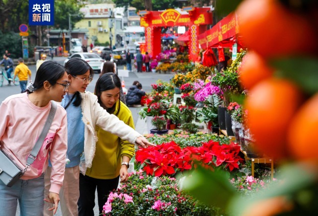 好一片热闹的新春气象。在广州中心城区的闹市里,换上了喜庆的红装,灯笼、挥春、福画、海味干果等洋溢着年味满满的过年气氛,市民三五结伴、一家几口相伴购买年花、年货,大家一同挑选心仪的年花、年货,同时也是一家人共同许下对新的一年共同的美好愿景。