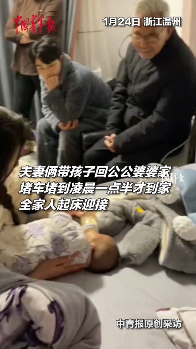 夫妻俩带孩子回家过年,凌晨一点半到家,全家人起床迎接