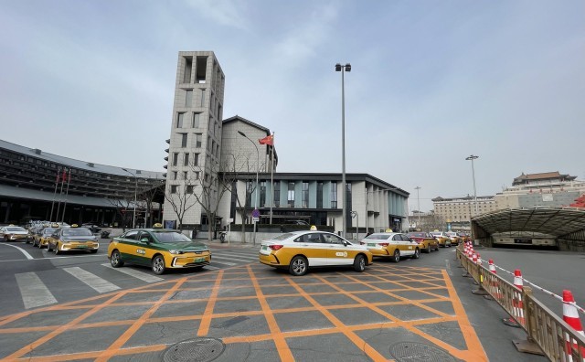 北京西站南广场外,排队等候进站的出租车。甘南摄。