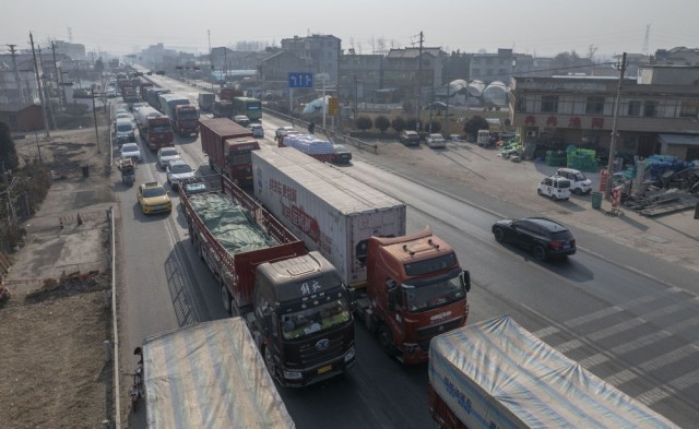 1月19日,孔令建夫妇驾驶大货车行驶在江苏省宿迁市沭阳县的205国道上(无人机照片)。新华社记者 才扬 摄