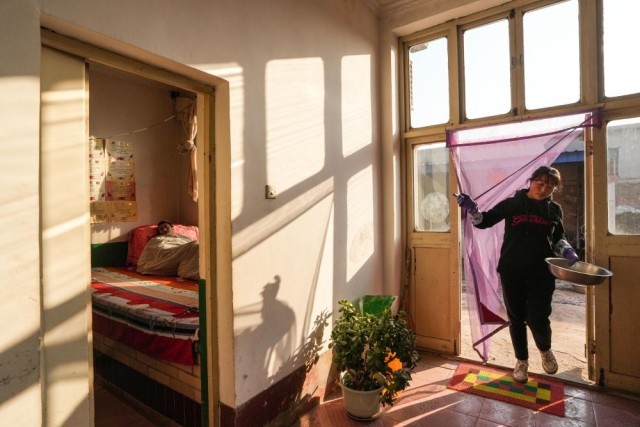 1月20日,回到家中,疲劳的孔令建(左)躺在炕上休息,妻子王艳青还在一旁忙碌。新华社记者 陈晔华 摄