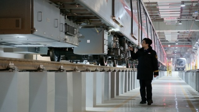 北京地铁新线春运保障的背后,离不开东坝车辆段值班人员的坚守。车库里,有着12年地铁驾驶经验的北京地铁运营四分公司运营安全管理中心带班主任张瑞平拿着手电筒,细致检查列车的每一个角落。
