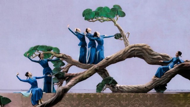 宋画以笔触细腻、意境深远著称,尤其是花鸟画,在宋朝迎来了独树一帜的黄金时代。编导参考大量宋画作品,尤其从南宋画家林椿的《十全报喜图》中获取灵感,将宋画的美学哲学完美地转译为舞蹈中的构图逻辑。舞台背景是纹理清晰的画布,幕帘和升降地屏搭建出裱框,整个舞台如同从水平面上翻转而立,变成巨幅的国画卷轴。