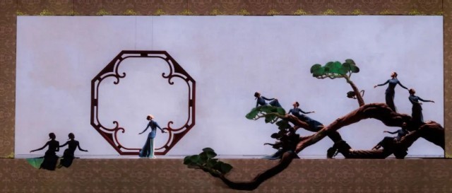 这是一幅工笔画般的舞蹈,“细腻的平面美”贯穿始终。多处剪影的运用更是剥离了立体细节,只留下气韵流转的线条,将所有的视觉重心都集中在平面构图之中。整个画卷上,舞者化身成画布上精心点缀的笔触,风枝摇绿影,鹊语落花间,每一个动作的铺陈、每一次舞姿的凝固,都精致得令人屏息。