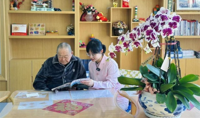 1月28日,记者和于讷老人一起读书。新华社发(车文雅摄)