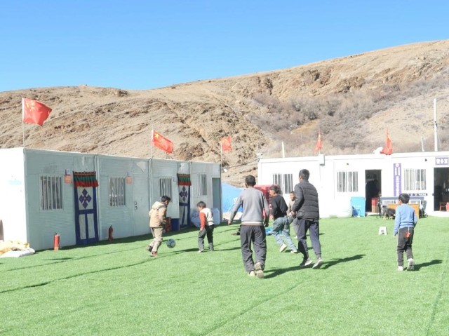 1月27日,在定日县长所乡古荣村板房安置点,孩子们正在踢足球。(受访者供图)