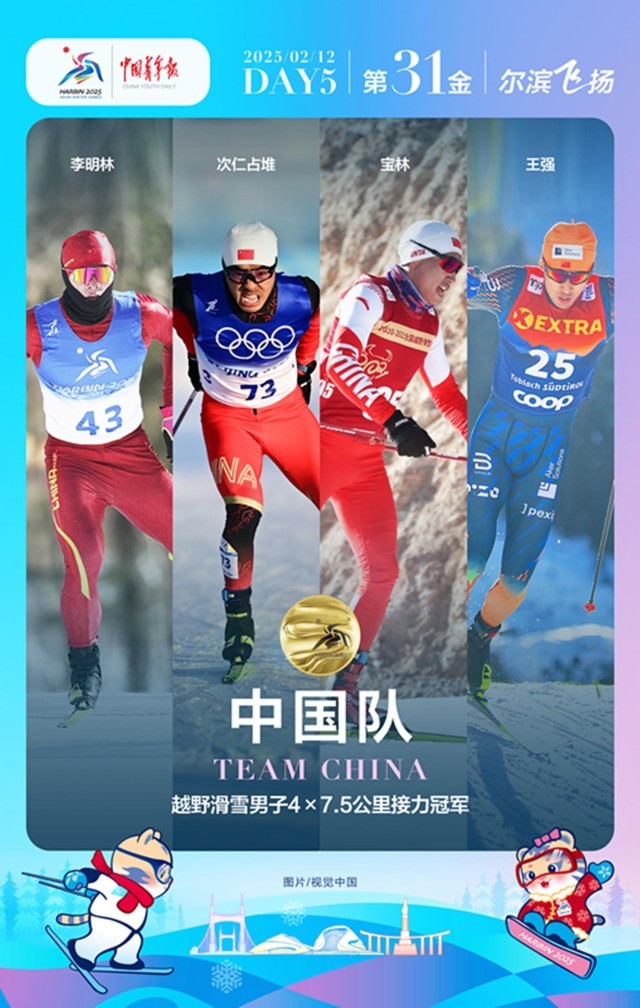 中国青年报客户端哈尔滨2月12日电(中青报·中青网记者 郭剑/文 聂亚栋/海报)1小时12分09秒6!最后1棒最后1个分段区逆转!中国队夺得越野滑雪男子4×7.5公里接力冠军!和中国队包揽前三名、前四名的比赛相比,本场男子4×7.5公里接力竞争极为激烈,哈萨克斯坦选手在第1棒结束时排名第一,中国队和日本队以3秒和11秒之差排在第二、三位,中国队第2棒次仁占堆一度缩小差距,但日本队第2棒完成反超并在第3棒保持第一,中国队最后1棒王强拼命前冲——他曾在此前男子个人短距离比赛中夺金——在最后1个分段区间王强反超日本选手,拿到这枚最沉的金牌。