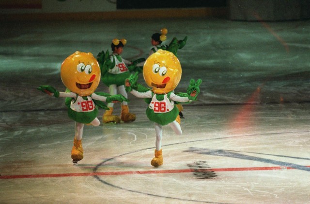 在哈尔滨举行的第三届亚冬会开幕式上,大型艺术表演《太阳·冰雪·亚细亚》中,本届亚冬会吉祥物豆豆伴随着活泼的儿歌,在冰上欢快地滑行。新华社记者 罗更前 摄(传真照片,1996年2月5日发)