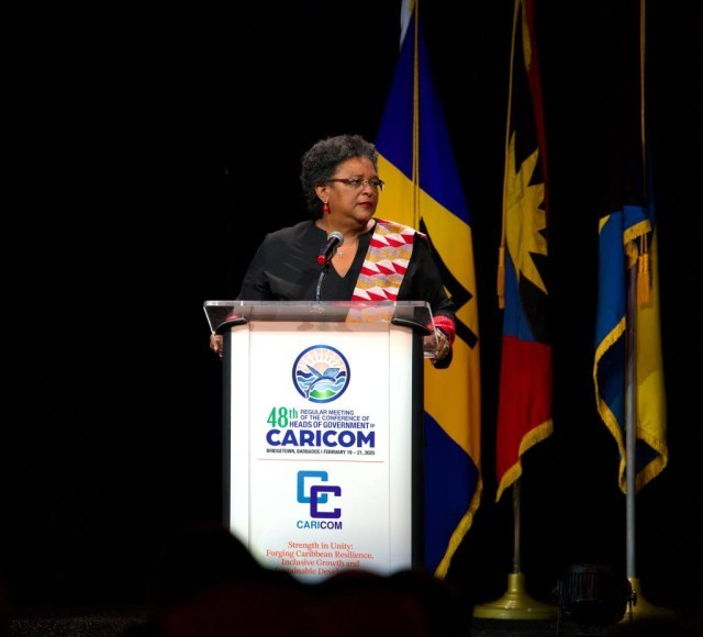 2025年2月19日,在巴巴多斯首都布里奇敦,加勒比共同体(加共体)轮值主席、东道国巴巴多斯总理莫特利在加共体第48届政府首脑会议开幕式上发言。新华社记者 蒋彪 摄