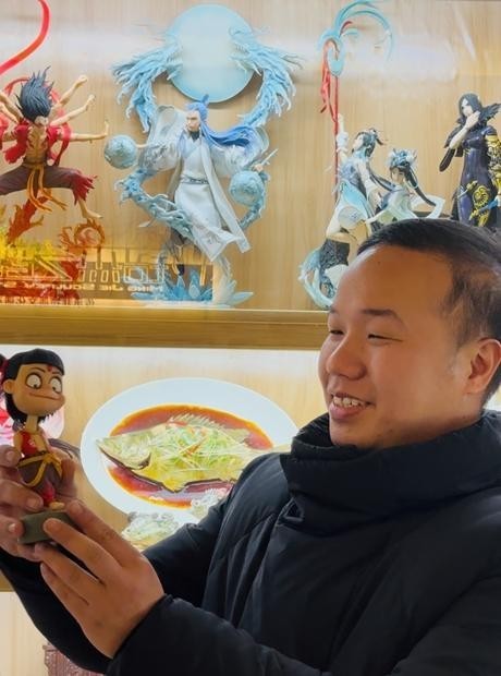 甄铭杰展示彩塑“小哪吒”。张玉荣/摄