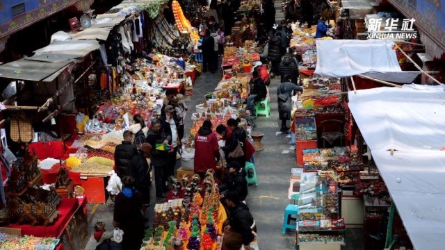 藏历新年将至,拉萨街头年味渐浓,人们忙着到市场采购年货。年货市场上,糖果、点心、新鲜牛羊肉等琳琅满目,烘托着藏历新年的喜庆氛围。