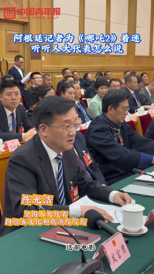 中国青年报客户端北京3月7日电(中青报·中青网记者 陈晓)今天在四川团的媒体开放日上,全国人大代表、四川省文化和旅游厅厅长陈光浩和来自阿根廷公共电视台的记者聊起了热映电影《哪吒2》。