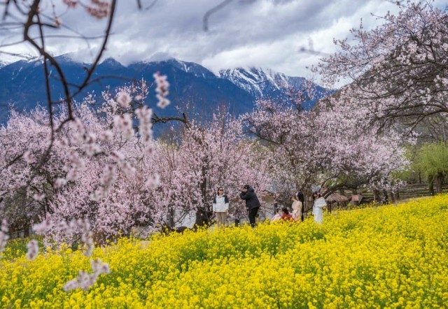 2024年3月,游客在林芝市巴宜区嘎拉村拍照留念。(新华社记者 孙非 摄)