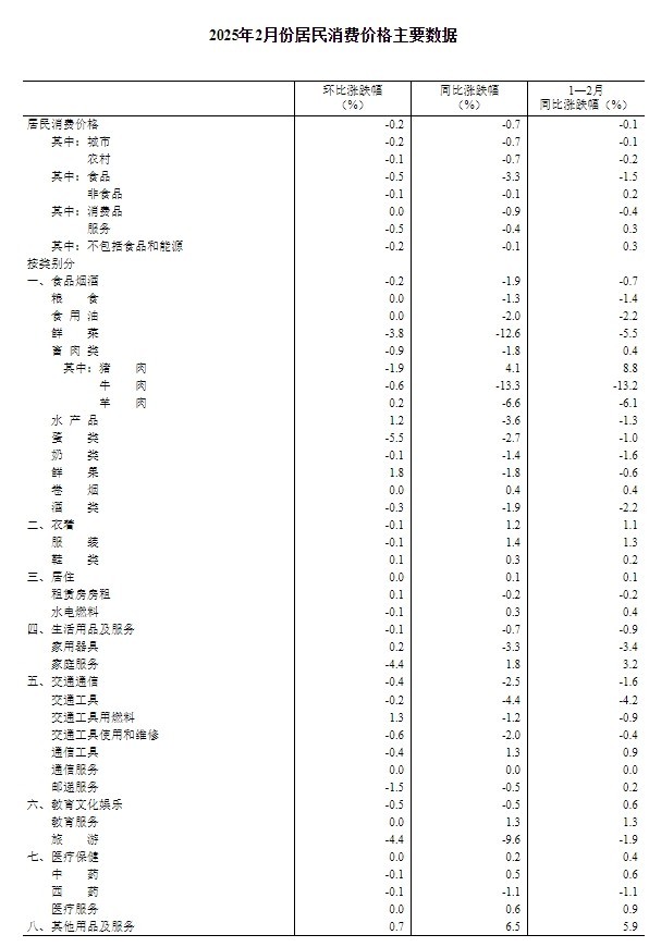 2025年2月份,全国居民消费价格同比下降0.7%。其中,城市下降0.7%,农村下降0.7%;食品价格下降3.3%,非食品价格下降0.1%;消费品价格下降0.9%,服务价格下降0.4%。1—2月平均,全国居民消费价格比上年同期下降0.1%。