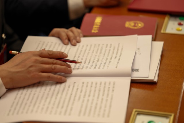 2025年3月5日,北京,第十四届全国人民代表大会第三次会议开幕。人大代表在政府工作报告上划重点做笔记。视觉中国供图