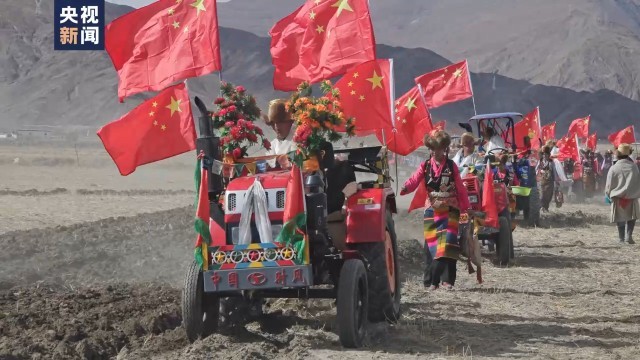村民们跳起欢快的传统舞蹈拉孜堆谐,40多台身着“盛装”的拖拉机则在青稞地里犁出了一首“春耕进行曲”。