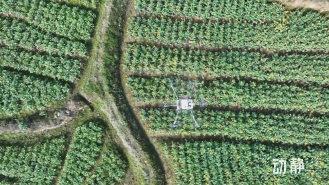 在黔东南州锦屏县新化所村的蔬菜基地里,一架搭载智能喷洒系统的无人机沿着油菜田低空飞行,均匀地将农药、叶岩肥喷洒在油菜上。
