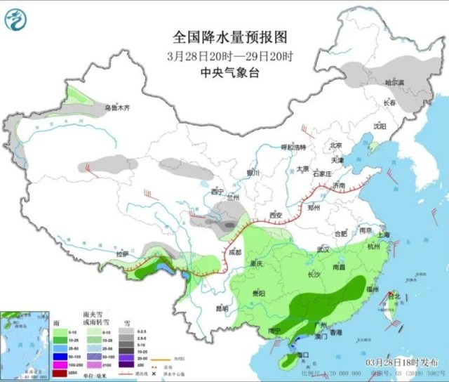 28日20时至29日20时,内蒙古东北部、黑龙江南部、吉林北部、新疆天山西部和南疆西部山区、西藏东部、青海北部和东部、川西高原北部等地部分地区有小雪或雨夹雪,其中,川西高原北部等地部分地区有中到大雪。西藏东南部、湖南南部、江西南部、福建东南部和西北部、华南北部和南部等地部分地区有中到大雨,其中,广东西南部沿海等地部分地区有暴雨。