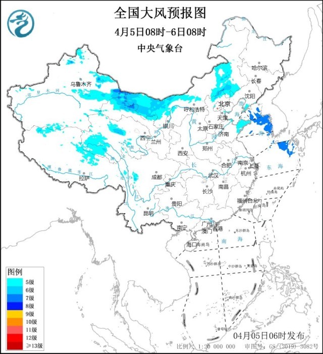 预计,4月5日08时至6日08时,新疆北部和东部、甘肃西部、青海中西部、西藏北部、内蒙古西部和东部、河北北部、辽东半岛、山东半岛等地部分地区有5~6级大风,阵风7~8级、局地可达9级以上;黄海东北部海域、东海东北部海域将有7级、阵风8级的大风。中央气象台4月5日06时继续发布大风蓝色预警。