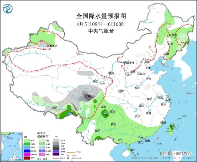 4月5日08时至6日08时,黑龙江东南部、吉林东部、新疆沿天山地区、西藏东北部、青海北部和南部、甘肃南部、川西高原中北部等地部分地区有小到中雪或雨夹雪,其中,川西高原北部等地部分地区有大到暴雪(10~12毫米)。新疆伊犁河谷、西藏东南部、黑龙江西部和南部、吉林中西部、辽宁东部、湖南南部和西部、广东、广西、四川盆地、重庆、贵州、云南大部、台湾岛等地部分地区有小到中雨,其中,西藏东南部、四川盆地东南部等地部分地区有大雨(25~35毫米)。内蒙古西部和东部、甘肃西部等地部分地区有4~7级风。