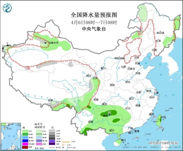 4月6日08时至7日08时,内蒙古东北部、黑龙江西北部、吉林东部、新疆沿天山地区和南疆西部山区、西藏东北部、甘肃河西和南部、川西高原北部等地部分地区有小雪或雨夹雪,其中,新疆沿天山地区和南疆西部山区等地部分地区有中到大雪(5~9毫米)。黑龙江东部、吉林东部、新疆北部、西藏东南部、湖南南部和西部、四川盆地南部、贵州、云南东部和南部、广西、海南岛北部、台湾岛等地部分地区有小到中雨,局地有大雨(25~35毫米)。新疆南疆高海拔山区、西藏西部等地部分地区有5~6级风。