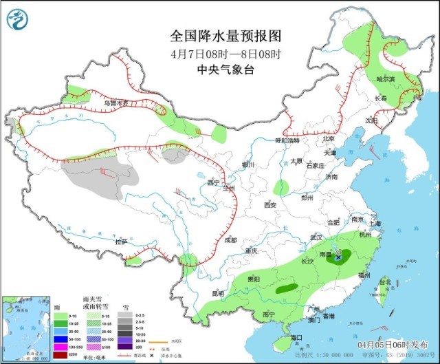 4月7日08时至8日08时,新疆南疆西部山区、西藏北部、青海北部和西部、甘肃河西等地部分地区有小雪或雨夹雪。新疆伊犁河谷、内蒙古东北部、黑龙江西部和南部、吉林中北部、湖南中南部、江西、浙江中南部、福建中北部、广东西部、广西、海南岛、贵州南部、云南东南部、台湾岛等地部分地区有小到中雨,局地有大雨(25~35毫米)。内蒙古东部和西部、西藏北部、青海南部和西部等地部分地区有5~6级风。
