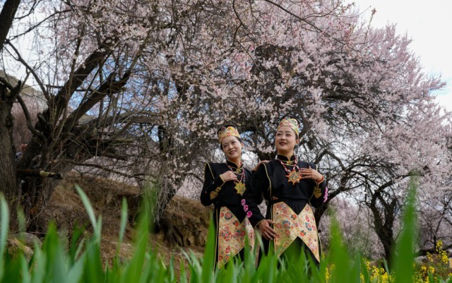 4月3日,两名游客身着民族服饰在林芝市巴宜区朵当村拍照。