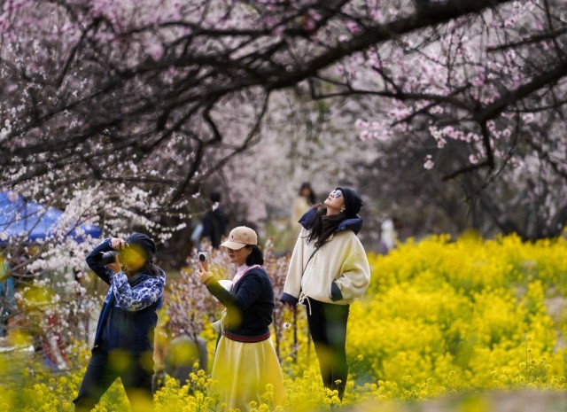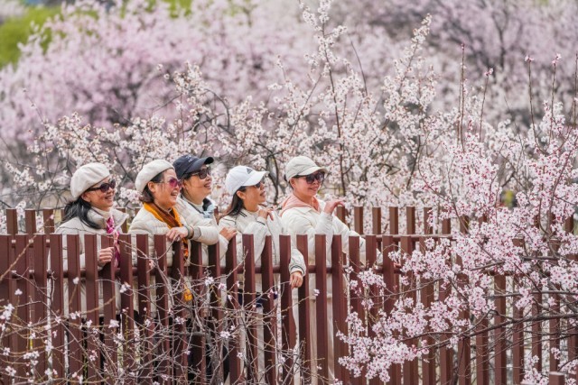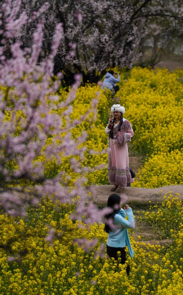 4月2日,游客在林芝市巴宜区嘎拉村欣赏桃花。