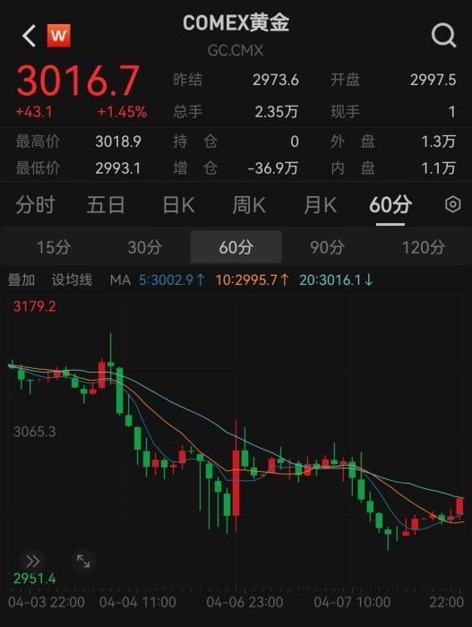 至4月7日早盘,伦敦金现和COMEX黄金自3月21日以来首次跌破3000美元关口。随后,COMEX黄金日内转涨,一度上冲至3084.4美元/盎司,收盘时再度回落至2998.8美元/盎司。