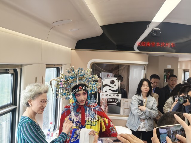 4月9日下午,“中原铁道·大河之南号”特色旅游列车上,豫剧表演艺术家与旅客互动。中青报·中青网记者 潘志贤/摄