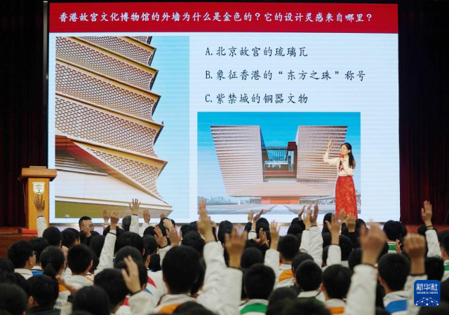 “同学们,你们知道香港故宫文化博物馆的外墙为什么是金色的吗?”在香港培侨中学的礼堂里,前来授课的人大附中分校教师高维阳抛出问题,课堂气氛活跃了起来。