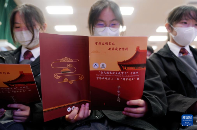 4月9日,在香港培侨中学,学生在“京港两地共上一堂国安课”活动上阅读学生手册。新华社发(王申摄)