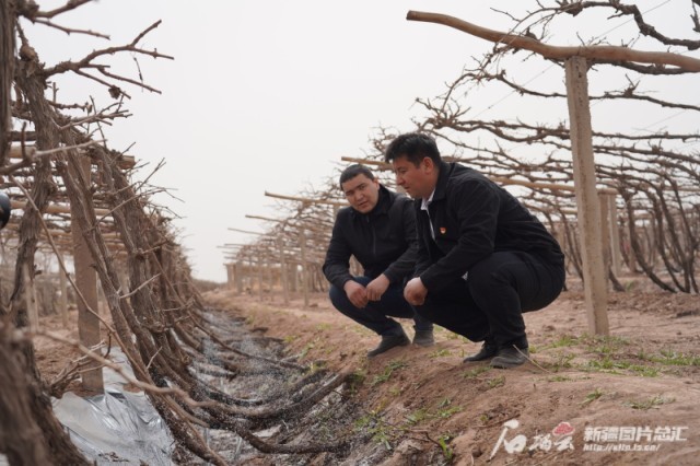 4月7日,在鄯善县吐峪沟乡洋海夏村葡萄地,村民艾海提·买买提(左)与村干部查看微喷灌管网水压。加帕尔摄