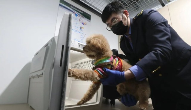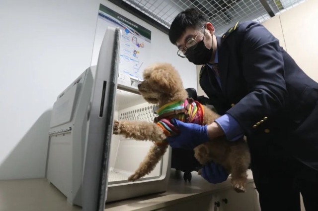 手续合格以后,安琳又跟随工作人员来到了不远处的宠物交接区域。一位工作人员戴着专门的蓝手套,轻柔地将“奥利奥”从安女士自带的箱子取出,装进高铁特制的宠物运输箱。