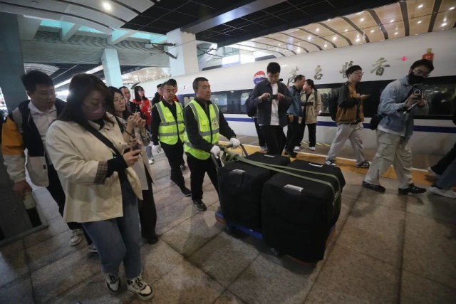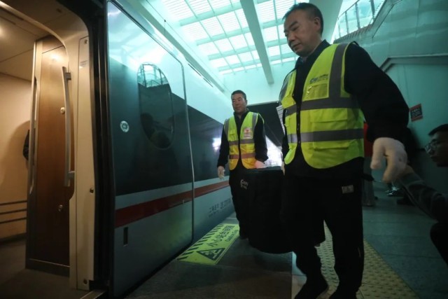 上午8点多,工作人员将宠物运输箱罩上一层黑色罩布,并麻利地将三个宠物运输箱装到平板推车上。两位工作人员将装有宠物的平板车运送到北京南站8站台,并送进G119次列车8号车厢的高铁快运柜中。北京日报记者注意到,高铁快运柜空间十分宽敞,设置在8号车厢的一侧,各个运输箱独立存放,不会对旅客造成影响。