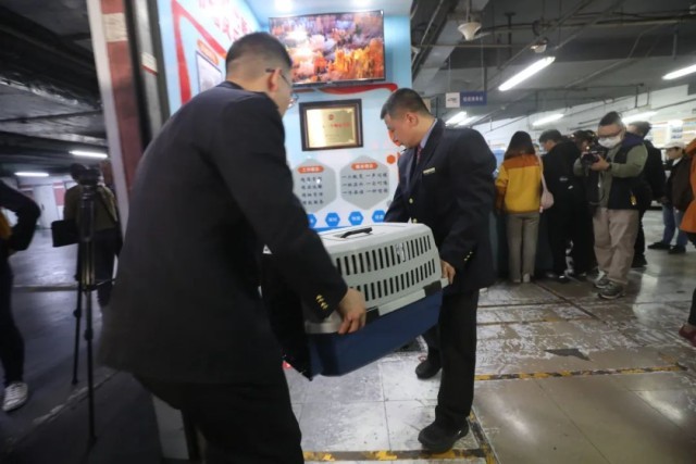 记者在现场看到,白色长方体外装的宠物运输箱“科技感”满满,可显示箱内温湿度、空气含氧量等情况。托运箱左下角设置了专门的加水槽,工作人员无需打开托运箱,就可在外侧为宠物箱内加水。中铁快运高级项目经理张磊告诉记者,该宠物运输箱专为高铁运输场景研发,采用环保材料,内设新风系统,处于全封闭状态,内置摄像头,工作人员可以实时监控箱体内部画面。“如箱内监测指标检测异常,工作人员能接到报警,第一时间前往处理。”