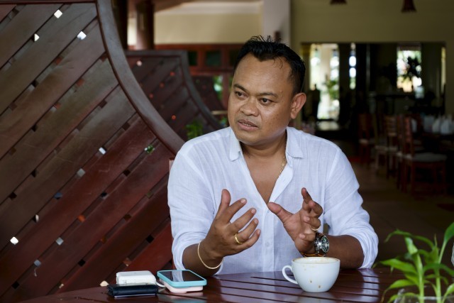 柬埔寨西港酒店协会会长陈绍鹏接受中柬媒体团记者采访。中青报·中青网记者 王岩/摄