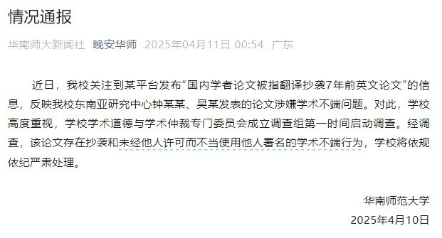 4月11日,就某平台发布“国内学者论文被指翻译抄袭7年前英文论文”一事,华南师范大学官方微信发布通报。全文如下: