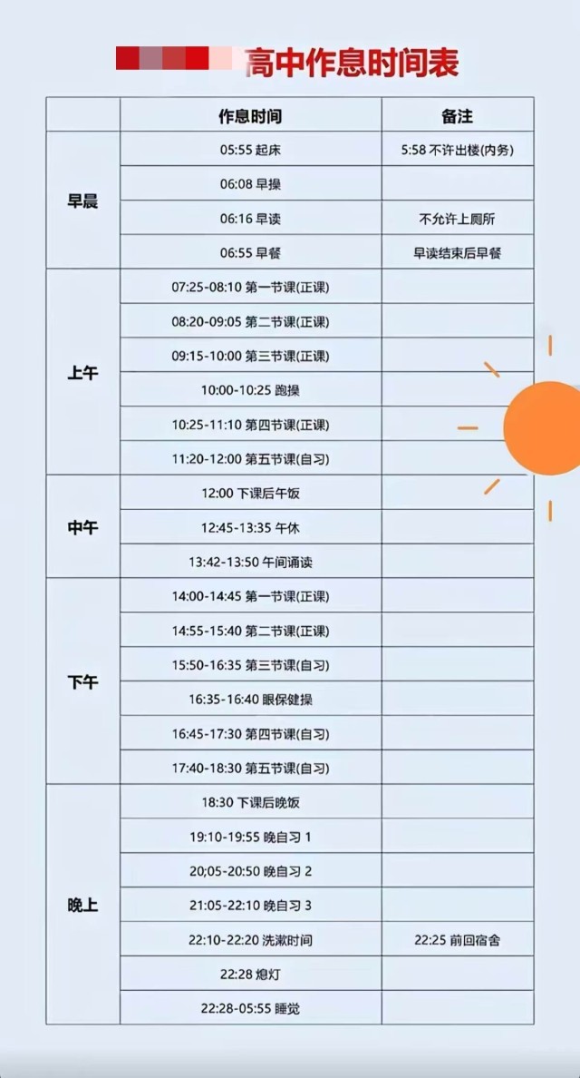 高中阶段,升学压力迫切地摆上台面,落在师生身上变成了见缝插针的作息安排。多位受访者能一口气把高中一天的作息从头到尾背出来,从早上6点左右到晚上10点前后,中间约16个小时,密密麻麻穿插着上课、考试与自习。