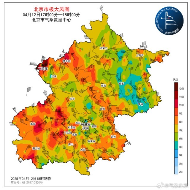 最近1小时(12日17-18时)我市部分地区阵风9~11级,山区局地14级。全市有73个测站极大风达9级以上(占比13%),20个测站极大风达10级以上(占比4%)。10级以上的站出现在丰台、房山、门头沟、延庆。全市最大阵风风速:高山站延庆二海陀44.9米/秒(14级);平原地区门头沟站26.8米/秒(10级)。