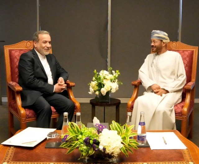 △当地时间2025年4月12日,伊朗外长阿拉格齐和阿曼外交大臣巴德尔(右)举行会晤。(图自路透社)
