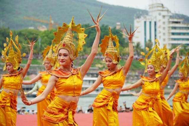 4月13日,在西双版纳傣族自治州景洪市,演员在傣历新年节(2025年泼水节)庆祝大会上表演。新华社记者 高咏薇 摄